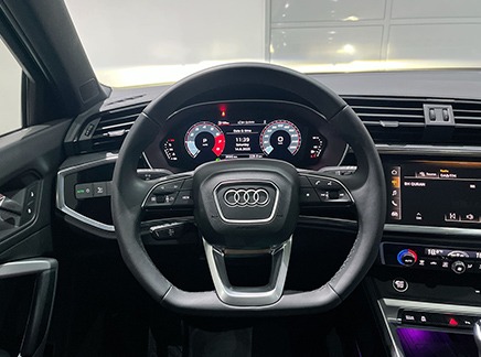 Leather-wrapped multi-function sports steering wheel, 3-spoke, flat-bottomed